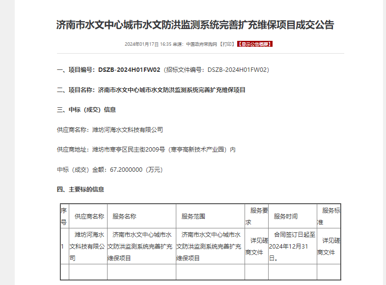 濟(jì)南市水文中心城市水文防洪監(jiān)測(cè)系統(tǒng)完善擴(kuò)充維保項(xiàng)目,項(xiàng)目金額67.2萬元,主要服務(wù)內(nèi)容為濟(jì)南市城市水文防洪監(jiān)測(cè)系統(tǒng)完善擴(kuò)充項(xiàng)目已建站點(diǎn)的日常運(yùn)行維護(hù)、保養(yǎng)、檢修,保障自動(dòng)測(cè)報(bào)設(shè)備正常運(yùn)行,使信息化平臺(tái)更好服務(wù)于防汛監(jiān)測(cè)和指揮調(diào)度。